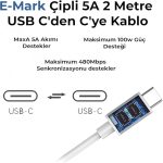 ✔ E-mark Çipli 5A 2 Metre USB C’den C’ye Kablo✔ BX-UC65WFTA özel 5A, yerleşik E-mark Çipidir ve maksimum 5A 100W güç ve 480Mbps veri senkronizasyonunu destekler. 2 Metre USB C – C Kablosu: Her yerde şarj etmenize ve eğlenmenize izin verir, telefonunuz ve dizüstü bilgisayarınız arasında 480 Mbps veri senkronizasyonunu destekler. Çalışırken veya yatakta yatarken dizüstü bilgisayarınızı veya Android telefonunuzu kolayca şarj etmenizi sağlar.