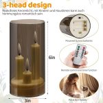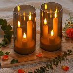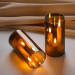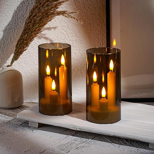 GERÇEKÇİ TASARIM: Titreyen alev efektli üç fitil LED sütun mumlar ve dumanlı gri cam tutucular, mum ışığında otantik bir ambiyans yaratır