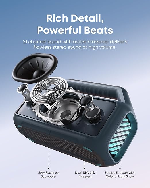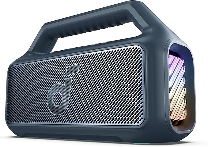 by Anker Boom 2 Bluetooth Hoparlör, 24 Saat Çalışma Süresi, 80W, RGB, 2.1 Stereo, IPX7, BassUp 2.0, Özelleştirilebilir EQ, Mavi
