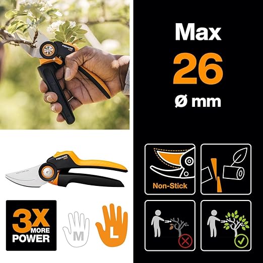 İçerik: 1x Fiskars X-serisi PowerGear Bypass Bahçe Makası, L P961, Uzunluk: 22,2 cm, Ağırlık: 222 g, Malzeme: Hassas çelik/yapışmaz kaplama, Renk: siyah/turuncu, 1057175