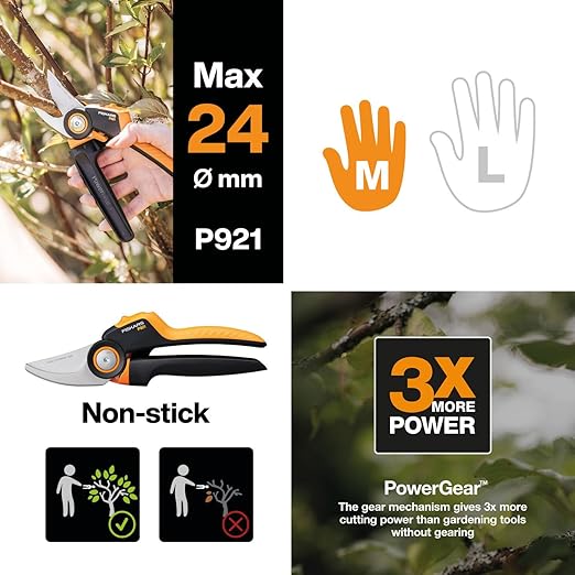 İçerik: 1x Fiskars X-serisi PowerGear Bypass Bahçe Makası, M P921, Uzunluk: 20,1 cm, Ağırlık: 220 g, Malzeme: Hassas çelik/yapışmaz kaplama, Renk: siyah/turuncu, 1057173