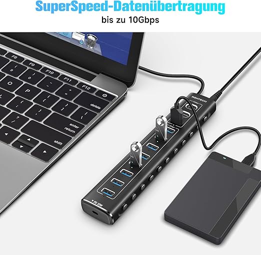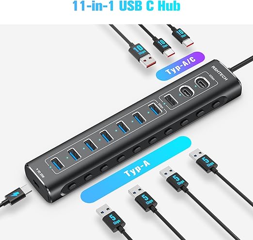 C 3.2 Hub Aktif Güç Kaynaklı (60W 12/5A), RSHTECH 11 Port USB C 3.1 Gen2 Hub 20W PD, 3 x 10Gbps USB 3.2 (2 x Tip C, 1 x Tip A), 7 * 5Gbps USB 3.0, 2’si 1 Arada Kablo, Alüminyum USB Dağıtıcı,