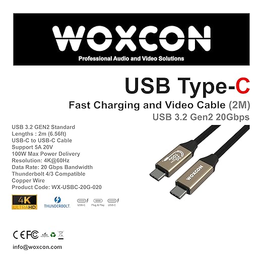 C Hızlı Şarj ve Görüntü Kablosu, USB 3.2 GEN2 Standart 20G Bandwith, Thunderbolt 4/3 uyumluluk, 4K 60Hz Çözünürlüğüne kadar destekler, 5A 20V, 100W Şarj Gücü 2 Metre