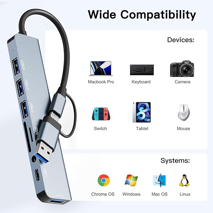Geniş Uyumluluk Bu USB-C hub çoklu bağlantı noktası adaptörü, çıkış için tüm USB-C/USB A bağlantı noktası sistemleri ve cihazlarıyla uyumludur; dizüstü bilgisayarlar, switch, Xbox, PS4, MacBook Pro, iMac, iPad Pro, Windows, Chrome OS, Linux ve ayrıca Huawei, HP, Xiaomi, klavye, fare, U disk ve diğer harici cihazlar gibi.