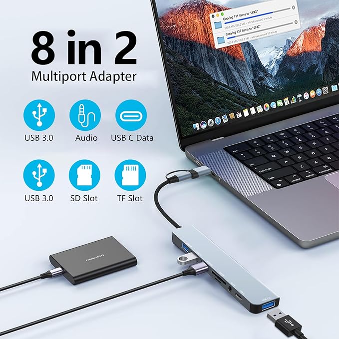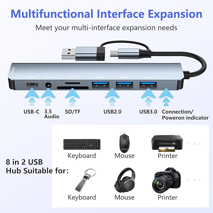 8’i 2 arada USB-C Hub: USB Type C Hub son derece kompakttır ve ihtiyacınız olan tüm bağlantı noktalarına sahiptir – 4 USB bağlantı noktası, 1 USB-C veri bağlantı noktası, 1 (3,5 mm) kulaklık girişi ve 1 SD ve TF kart bağlantı noktası. Aynı anda bir fare, klavye, USB sürücü, SD kart veya microSD kart bağlamak için kullanabilirsiniz, bu da veri aktarımını, düzenlemeyi, indirmeyi ve fotoğraf aktarımını daha rahat ve verimli hale getirir.