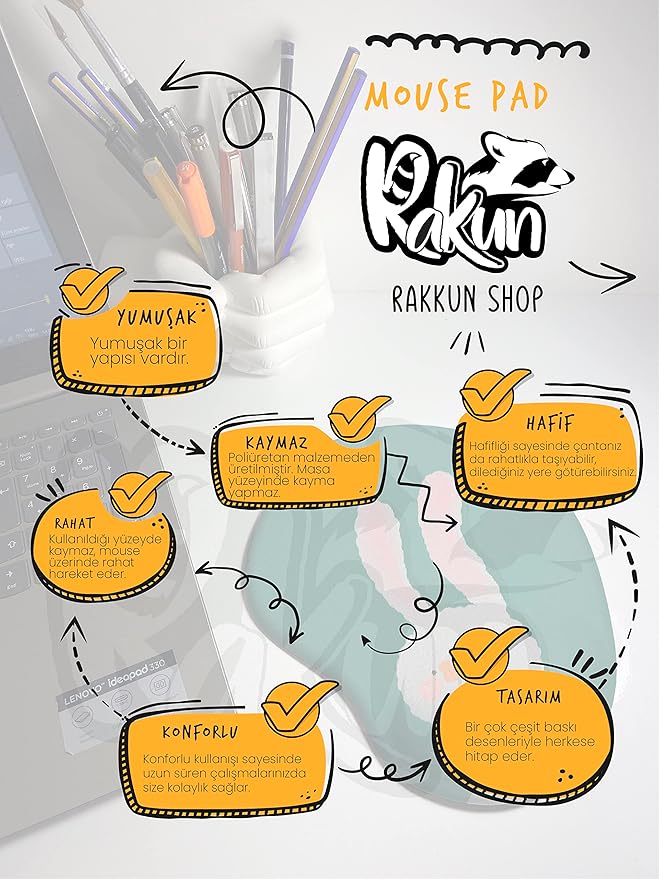Poliüreten malzemeden üretilmiştir. Masa yüzeyinde kaymaz. Mouse üzerinde rahatça hareket eder.