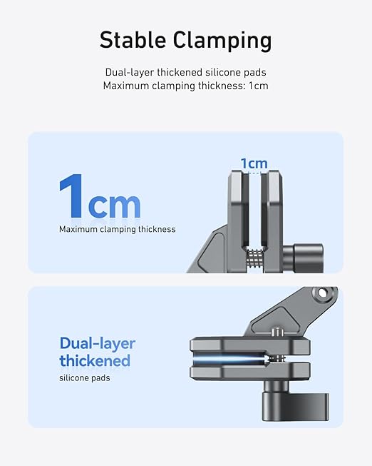 【Gelişmiş Koruma ve Uyumluluk】Alüminyum alaşımlı motosiklet ön cam klipsi kelepçesi, çizilmelere karşı ek koruma ve gelişmiş kavrama için çift katmanlı kalınlaştırılmış silikon ped içerir. Montaj seçeneklerinde daha fazla uyumluluk ve esneklik için hem taban tokası hem de 1/4 somun deliği ile donatılmıştır.