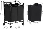 çamaşır ayırıcı, tekerlekli ve 2 bölmeli, çamaşır sepeti, çıkarılabilir çantalı çamaşır arabası, toplam kapasite 90 l, siyah, LSF002BK