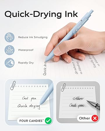 0,5 mm hızlı kuruyan mürekkep: Bu geri çekilebilir tükenmez kalem solmaya dayanıklı mürekkeple güvenilir bir mürekkebe sahiptir. Mürekkebin ellerinize veya çalışma masanıza bulaşması konusunda endişelenmenize gerek yok, çünkü solmaz, akmaz veya bulaşmaz; tükenmez kalem mürekkebi hızlı kurur ve işinizi düzenli ve düzenli tutmanıza yardımcı olur. Not: Jel kalemi kullandıktan sonra kalemi düz bir şekilde koymanız veya kalemi yukarı doğru tutmanız önerilir. Böylece kalem ucu korunur.