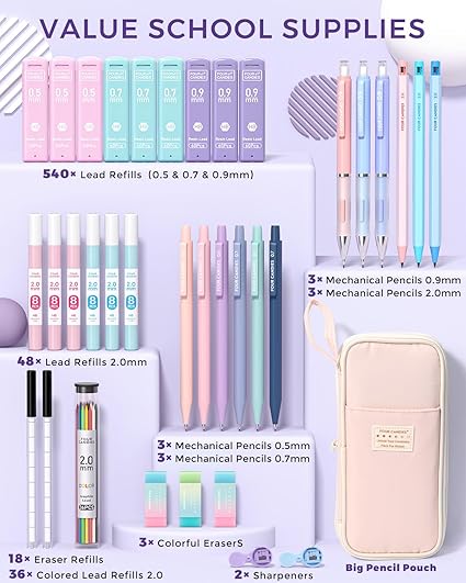 Değerli Mekanik Kombinasyon: estetik okul malzemeleri seti 5 farklı tipte mekanik kurşun kalem, 13 adet 0,5 mm ve 13 adet 0,7 mm, 3 adet 4B silgi, 18 adet silgi yedekleri, 12 tüp mekanik kurşun kalem dolgusu ve süslü büyük kapasiteli kalem kutusu ile birlikte gelir