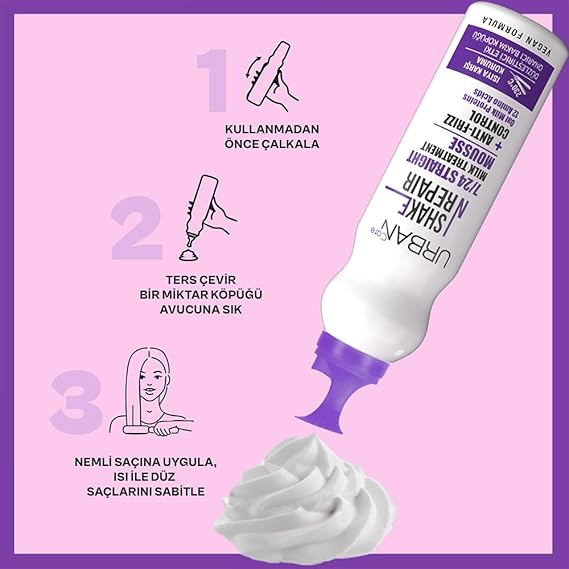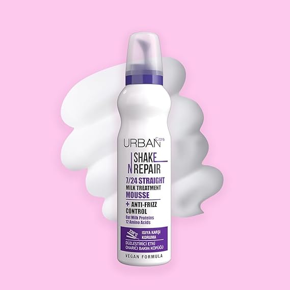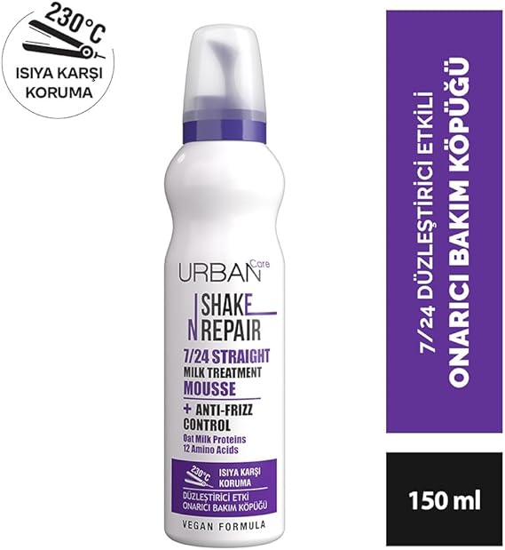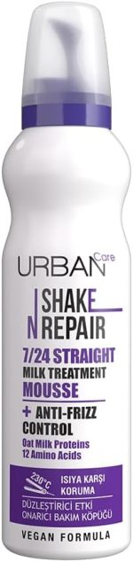 URBAN Care Shake N Repair 7/24 düzleştirici etkili saç bakım köpüğü, özel formülü ile uzun süreli düz saç stilleri oluşturmak için zor şekil alan ve kabaran saçları hedefler