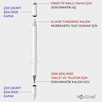 Kullanma Yöntemi : Kalem üzerinde Çek-Aç şeklinde açılan 2 adet kapak vardır. Bu kapaklardan bir tanesi üzerinde bulunan “Fiber Uç” ile Akıllı Tahtalarda kalem olarak kullanabilirsiniz. Kapakları Açtığınızda çıkan Disk şeklindeki silikon uç; “Dokunmatik Kalem” Ucudur. Disk Şeklindeki bu uç ile tüm tablet ve telefonlarda dokunmatik kalem olarak kullanabilirsiniz. Diğer taraftaki kapak açıldığında çıkan uç ise Tükenmez Kalemdir. Klasik tükenmez kalem olarak kağıda yazı yazmak amacıyla kullanabilirsiniz.