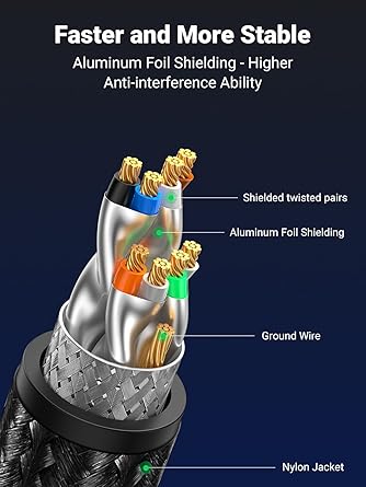 Gigabit Ethernet Kablosu: UGREEN Cat8 Ethernet kablosu, kesinti olmadan 40 Gbps’ye kadar hızlı veri aktarımını (10 Gbps’de Cat6a’ya kıyasla 4x) ve 2000 MHz bant genişliğini (500 MHz’de Cat6a’ya kıyasla 4x) destekler. Çevrimiçi oyunlar, TV/film akışı, dosya indirme vb. için harika bir seçim.