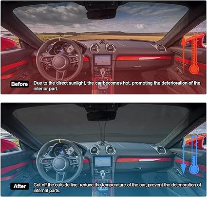 【Fiziksel sıcaklık düşürme】: Farklı fonksiyonlara sahip 2 taraf, gümüş taraf UV ışınlarını yansıtır ve siyah taraf ısı iletimini izole eder. Güneş şemsiyeleri güneş parlamasını azaltmaya ve ısıyı azaltmaya, ısı kalkanı sağlamaya ve aracınızı serin tutmaya yardımcı olur.