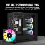 CORSAIR AirGuide teknolojisi: AF120 RGB ELITE fanlar, 2100 RPM ve 65,57 CFM’ye kadar yüksek hızlarda güçlü hava akımı sağlar. Statik basıncı artıran ve daha iyi soğutma için hava akışını yönlendiren CORSAIR AirGuide teknolojisini kullanır.
