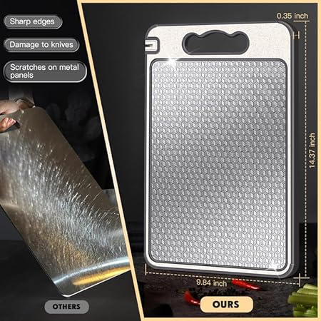 Çelik Kesme Tahtası, Mutfak için Çift Taraflı Doğrama Tahtası, Çizilmeye Dayanıklı Mesh Tasarımı, Meyve Suyu Yivi, Kaymaz Silikon Sarma, Bulaşık Makinesinde Yıkanabilir