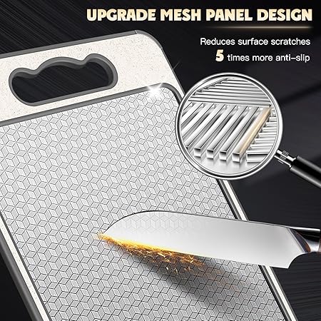 MESH PANEL TASARIMI: Örgü tasarımı metal panellerdeki çizikleri azaltır, bıçakların hızlı bir şekilde kaymasına ve donuklaşmasına, dayanıklı ve hacimli olmamasına neden olan sıradan metal kesme tahtalarının eksikliklerini iyileştirir.