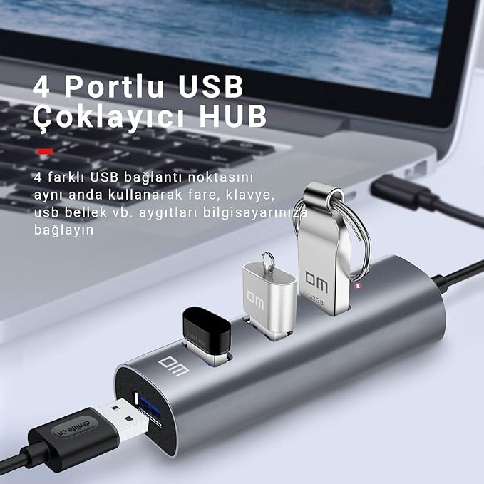 DM CHB010 Type-C to USB 3.0 4 Portlu Alüminyum Hub Çoklayıcı ile masaüstü bilgisayar ve notebooklarınızda yer alan USB port sayısını çoğaltabilirsiniz. Üzerinde bulunan 4 adet USB 3.0 portları ile yüksek hızlarda veri aktarımı sağlar. Ayrıca cihazın arka tarafında bulunan micro USB girişini kullanarak ekstra enerji verilebilmektedir.