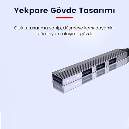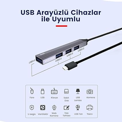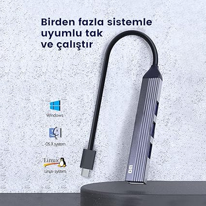 DM Type-C 1 Port USB 3.0 3 Port USB 2.0 Hub Çoklayıcı, Type-C üzerinden bilgisayarınıza 1 adet USB 3.0 3 adet USB 2.0 kazandıran alüminyum gövdeye sahip DM HUB ile dosyalarınızı hızlı bir şekilde aktarabilir veya diğer USB cihazlarınızı kullanabilirsiniz.