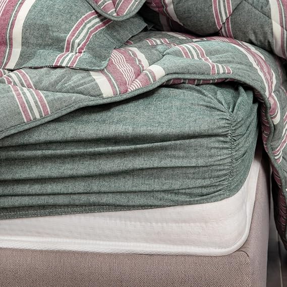 Tasarımına özel dokumasıyla net ve canlı bir görünüm sunan Chevron İpliği Boyalı Uyku Seti, yeşil tonlarının enerjisiyle yatak odalarında huzurlu ve şık bir atmosfer yaratıyor. .