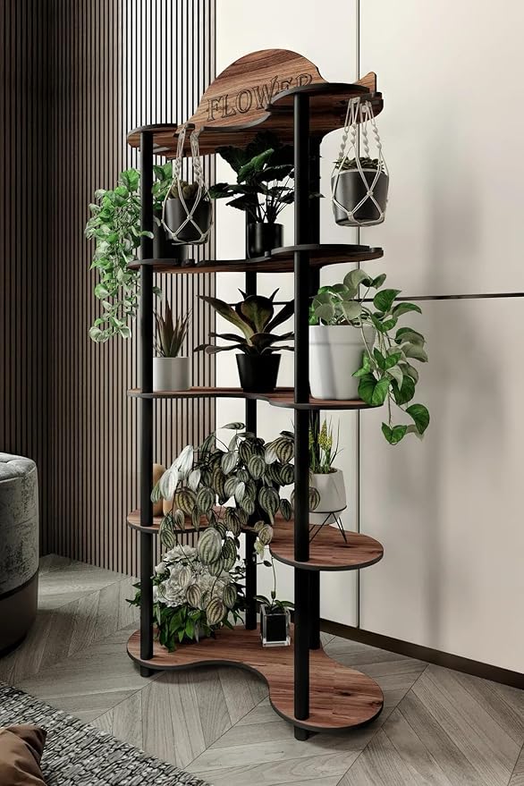 ÇİÇEKLİK SAKSILIK CEVİZ – Modern Siyah Ahşap Ayaklı, Siyah Renkli Retro Tasarım, Ev ve Ofis Dekorasyonuna Uygun, Çok Katlı Bitki Standı, Saksı Raf Ünitesi