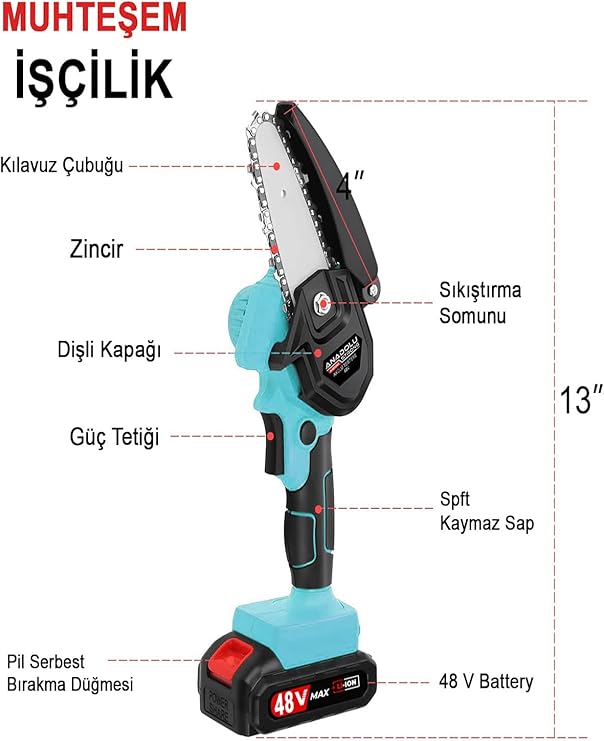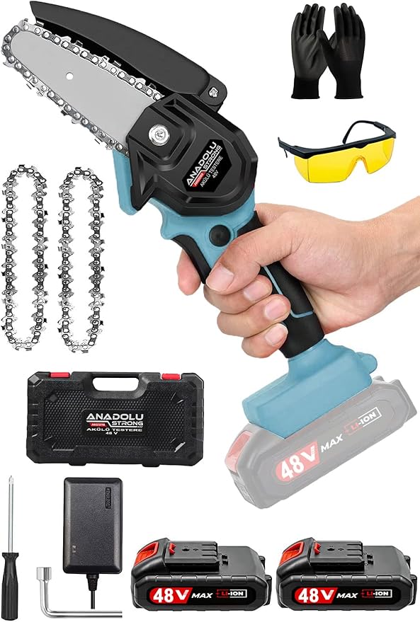 Çift Akülü Çift Zincirli Budama Testeresi Taşıma Çantalı 48V Şarjlı Testere Eldiven Hediyeli