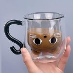çift duvarlı kapaklı cam kedi kupası – sıcak ve soğuk içecekler için kedi motifli içme bardağı, 300 ml kapasiteli