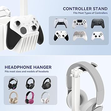 Çift kontrol cihazı tutucu, kulaklık standlı, evrensel çalışma masası düzenleyici, cep telefonu tutuculu, Xbox ONE PS5 PS4 PC için çok fonksiyonlu oyun düzenleyici, ofis, ev, beyaz