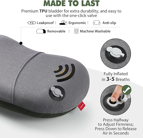 Rahatlamış anlar için mükemmel sağlamlık – Gecenin ortasında uyanma ve boynunuzun sert olduğunu ve şişme yastığın yürüyüş sırasında kaydığını fark etmekten endişe etmenize gerek yok. Kamp yastığımızın kaymaz alt kısmı silika jel şeritlere sahiptir, bu sayede uyku matlarında, kamp yataklarında veya hamaklarda kaymayı önler. Uyku konforu garanti edilir