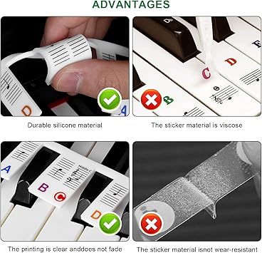 Silikon Malzeme: Piyano kaplamamız, aşınmaya ve yıpranmaya karşı dayanıklı, yüksek kaliteli ve dayanıklı bir malzeme olan silikondan yapılmıştır. Etiketleri seri olarak bağlar, tuşlara yapışmaya gerek yoktur. Su geçirmez, yıkanabilir ve tekrar kullanılabilirler.