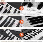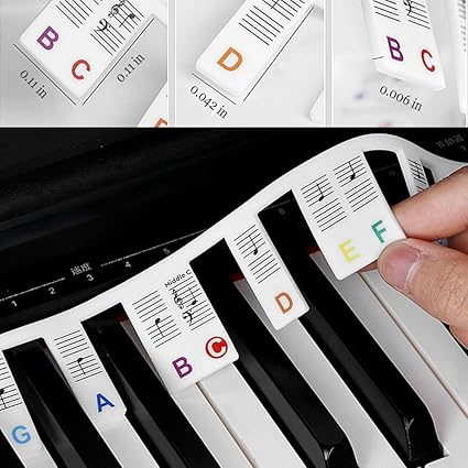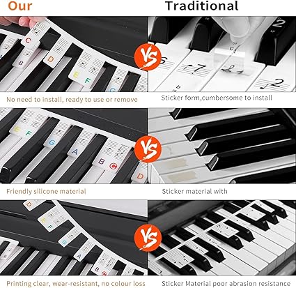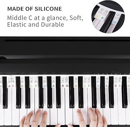Silikon: Piyano tuşu çıkartmalarımız, dayanıklı, tekrar kullanılabilir ve katlandığında veya kıvrıldığında deforme olmayan yüksek kaliteli silikondan yapılmıştır; aynı zamanda hoş bir dokunma hissi verir ve plastik kokusu yoktur