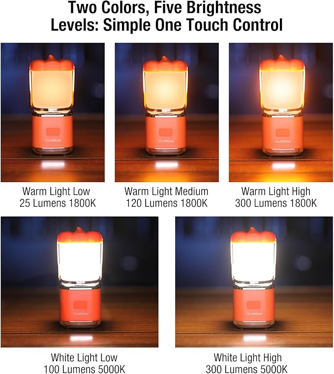 Yeterli Parlaklık: Bu kamp lambası 300LM ile 2 renk sıcaklığına ve 5 çıkış seviyesine sahiptir. 360° her yöne aydınlatma özelliğine sahip, yumuşak difüzörlü titremeyen LED ışıklar göz yorgunluğunu azaltır, görüşünüzü korur ve daha konforlu bir aydınlatma deneyimi sunar.