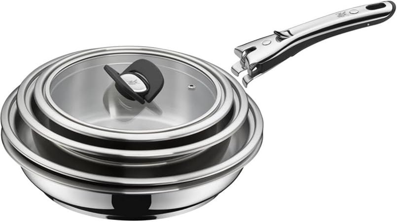 İçerik: 2 x sapsız saplı tencere 16 cm, 20 cm, 1 x sapsız sos tavası 24 cm, 1 x kızartma tavası 28 cm sapsız kaplamalı, 2 x cam kapak 20 + 24 cm, 1 x çıkarılabilir sap – Ürün numarası: 0795076820