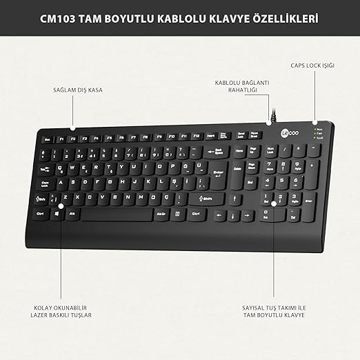 Basitlik ve Şıklık Bir Arada: Lecoo CM103 Klavye & Mouse Set, sade ve şık tasarımıyla çalışma alanınızı güzelleştirirken işlevselliğiyle de öne çıkıyor. Kolay okunaklı tuş takımı sayesinde her işi kolaylıkla halledebilirsiniz.