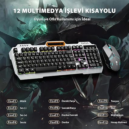 【GÜÇLÜ PERFORMANS ŞIK TASARIM】3 tuşlu ve 1200 DPI’ye kadar hassasiyeti olan Mouse, hafif yapısıyla kontrolü elinizde tutmanızı sağlar. Klavye ise 10 milyon tuş ömrü ve renkli aydınlatmasıyla öne çıkıyor.