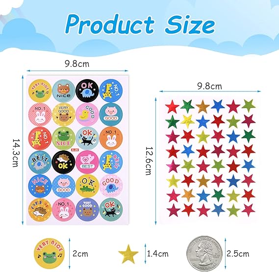 【Alacaksınız】10 hayvan ilham verici çıkartma ve 20 yıldız çıkartması alacaksınız, her hayvan çıkartması 24 çıkartma ve yıldız etiketinin her birinde 48 çıkartma vardır. Çok çeşitli stil ve renklerde mevcuttur, her biri çocuklar için bir ödül olarak mükemmeldir.