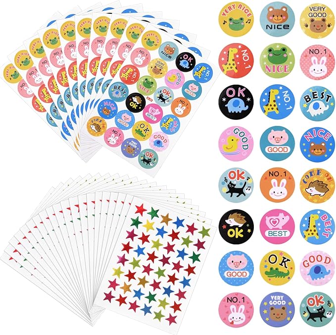Çocuklar için Ödül Çıkartmaları, 1200 Motivasyon Çıkartması, 20 adet Yıldız ve Hayvan Ödülleri