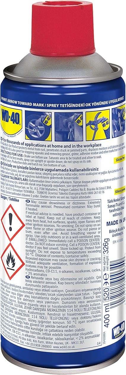 Ambalaj içeriği – WD-40 Problem çözücü, pas önleyici, temizleyici, yağlayıcı ve koruyucu. Koruma ve bakım sağlayan çok amaçlı sıvı, makine ve elektrikli cihazlar için bakım spreyi, 1x400ml