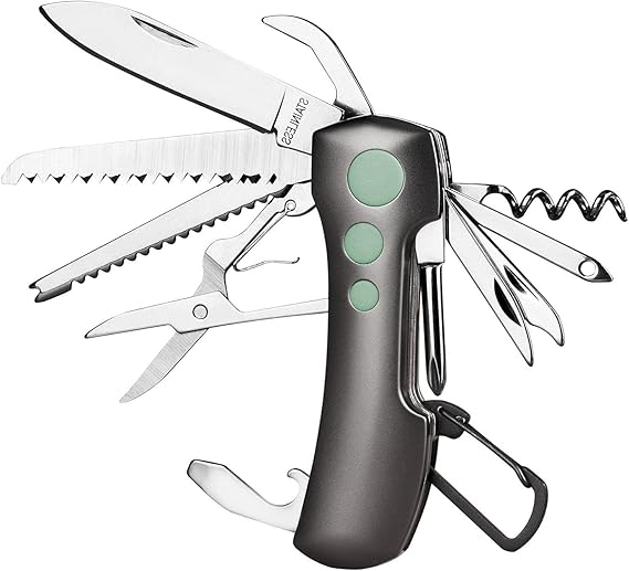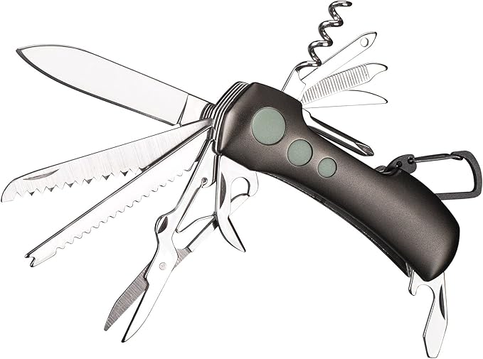 Çok Fonksiyonlu Tasarım: 14 farklı aletle donatılmıştır, bıçak, testere, balık çubuğu tutucu, balık pulu soyucu, makas, sivri uçlu delici, gazoz kapağı açıcı, tornavida uçları, kemer askılık, kontrol halkası ve tırbişon gibi çeşitli aletleri içerir.
