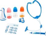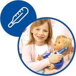 Çocuklar, hastalığını tespit etmek için stetoskopla göğsünü dinliyor ve termometreyle ateşini ölçebiliyor.