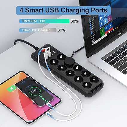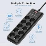 Çoklu priz, 10’lu (4000 W 16 A), 4 USB’li aşırı gerilim koruması, çoklu priz, duvara montaj, çocuk emniyeti 2 m kablo, ev, ofis için priz