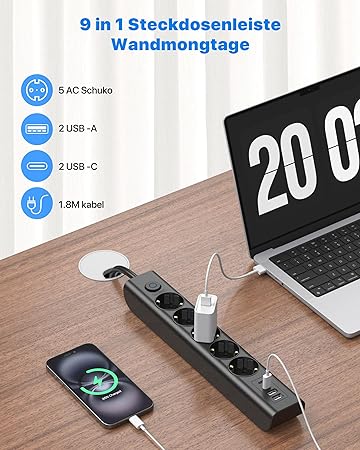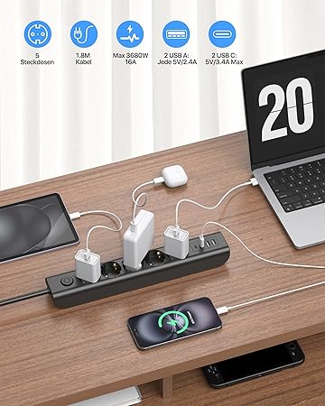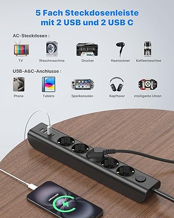 USB, USB C, topraklı prizler 45° düzenlemeli, açılı priz için de uygundur. 5 prizli çoklu priz 4 yüzeyde dikeydir, normal çoklu fişlere göre yerden tasarruf sağlar.