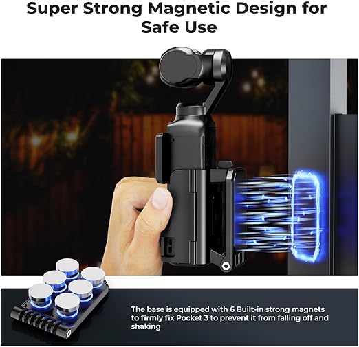 DJI Osmo Pocket 3 için geliştirilmiştir: Manyetik tutucu, DJI Osmo Pocket 3 için özel olarak geliştirilmiş bir aksesuardır. Kamera tuşlarının ve Joystick’lerin normal kullanımını veya alt hızlı germe ve şarj fonksiyonunu etkilemez. Arka toka kolayca açılır ve kapanır ve DJI Pocket 3’ün kamerasına mükemmel uyar.