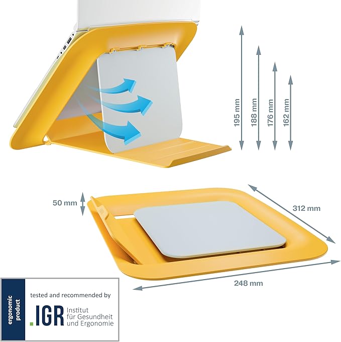 Teslimat kapsamı: 1 x Leitz dizüstü bilgisayar standı, yüksekliği ayarlanabilir, ölçüler (G x Y x D): 312 x 50 x 247 mm, 380 g, sıcak sarı, Ergo Cosy Serisi, 64260019