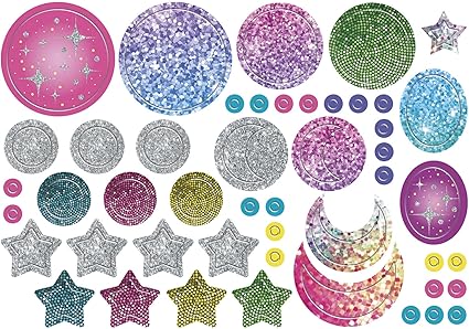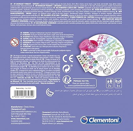 Setin içeriği: alüminyum kolyeler ve yüzükler, metalik ve renkli plastikten yapılmış, ay ve yıldız biçimlerinde uçlar, holografik çıkartmalar ve bir takı standı.