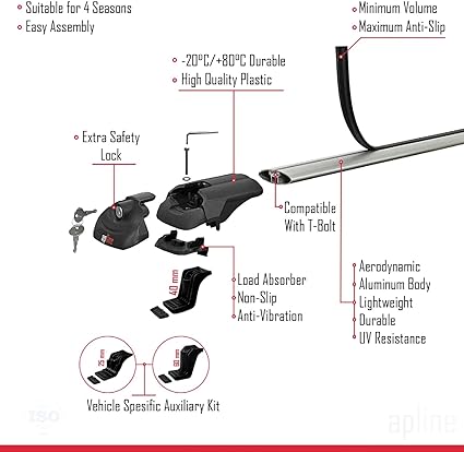 Alüminyum barlar ile hareketli araçta 75kg’a kadar taşıyabilir. Park halindeki araçta, 2 bardan oluşan üründe 150kg, 3 bardan oluşan üründe 225kg maksimum yük önerilir.