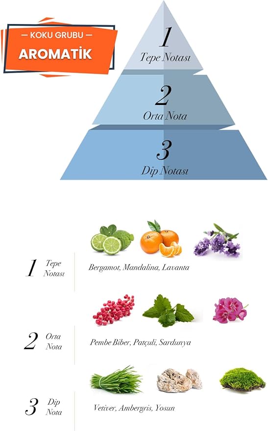 KOKU NOTALARI: EDP parfüm (Eau de Parfum) yoğunluk olarak en fazla koku veren parfümlerdir, etkisini gün boyu yanınızda hissedersiniz. Tepe notalarında ferahlatıcı bergamot, canlandırıcı mandalina ve rahatlatıcı lavanta bulunurken, orta notalarda sardunya, pembe biber ve paçulinin enerjik ve çekici etkisi hissedilir. Dip notalarda ise vetiver, amber ve yosunun derin ve maskülen karakteri ortaya çıkar.