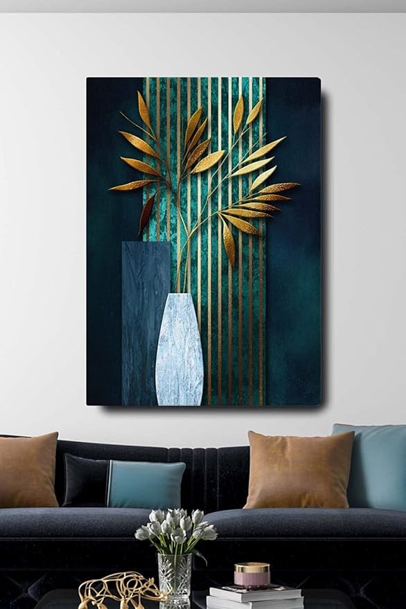 Dekoratif Soyut Altın Yapraklı Vazo Sürreal Kanvas Duvar Tablosu 70 x 100 cm