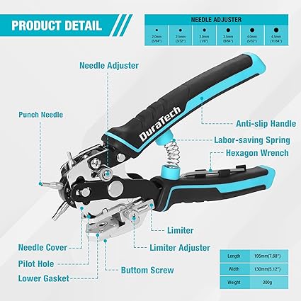 6 boyut: Deri, kağıt, DIY çanta, ayakkabı, plastik, ince metal plakalar (0,3 mm’den az bakır, alüminyum, ısıtılmamış demir plakalar delinebilir), evcil hayvan tasmaları (deri veya kumaş) gibi çeşitli malzemeler için uygun delik çapı 2 ila 4,5 mm arasında değişen 6 farklı delik.