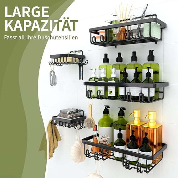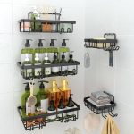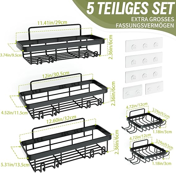 Delmeden duş rafı, 5’li set, sabunluklu, banyo rafı, siyah